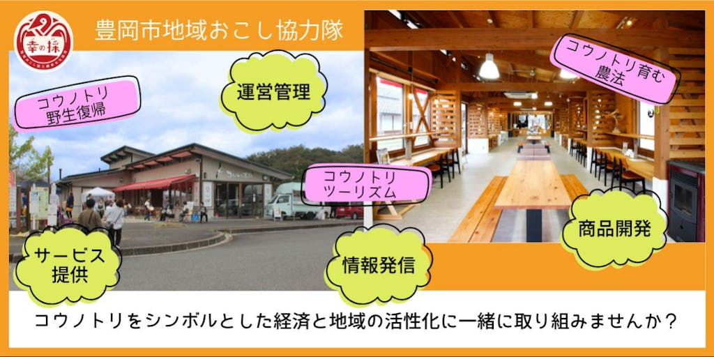 その運営母体である「コウノトリ羽ばたく会(株)」と一緒に、「環境」と「経済」の好循環を体現する魅力ある施設として、運営に取り組んでくれる方(地域おこし協力隊)を募集します。