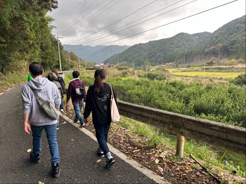 今回の「ゆずきち収穫&交流体験」には下関市や防府市など山口県各地にお住まいの方々がご参加されていました。山口県内では「長門ゆずきち」は希少な柑橘類として知られており、県内各地の「長門ゆずきち」ファンの皆さんが、「ゆずきち収穫」を楽しみにはるばるお越しになっていました。 まずは俵山温泉に集合し、俵山温泉からゆずきち畑までの約20分の田舎道をみんなで談笑しながらウォーキング。田んぼが広がる風景の中、ガイドツアーの井上さんの俵山や長門市についてのまち案内を聞きながらゆずきち畑を目指しました。ガイドさんのお話を聞いたり、参加者同士で談笑をしながらだと20分の道のりなんてあっという間。ほどよいウォーミングアップとなりました。