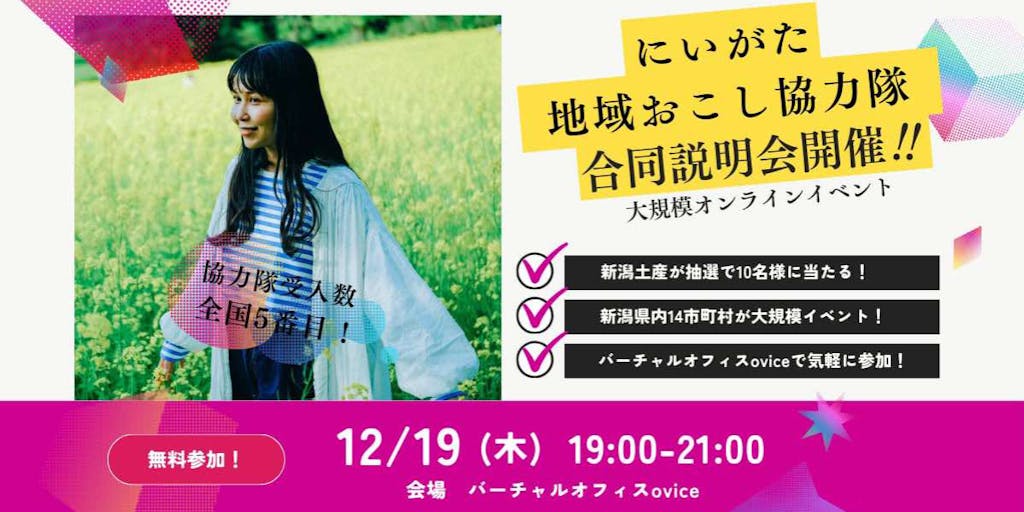 2024/12/03新潟県の地域おこし協力隊に関心のある方、新潟移住に関心のある方、新潟県内の地域おこし協力隊の最新情報が手に入るオンラインイベントが開催されます!是非とも、この機会にご参加ください!