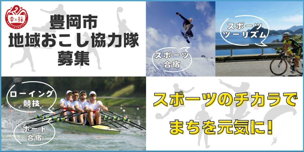 【こんな人材を求めています!】 ・普通自動車免許必須(豊岡は兵庫県で最も広いまちです) ・現在スポーツに携わっている方、スポーツに携わってきた方、スポーツが大好きな方 ・スポーツといえば「ローイング競技だ!」という方 ・「スポーツ×観光」に興味がある方 ・市職員、団体職員、地域おこし協力隊の仲間たちと楽しく仲良く働ける方 ・子どもから高齢者まで幅広い年齢層の方とコミュニケーションが取れる方 ・まちに新しい風を吹き込める、明るく元気な方