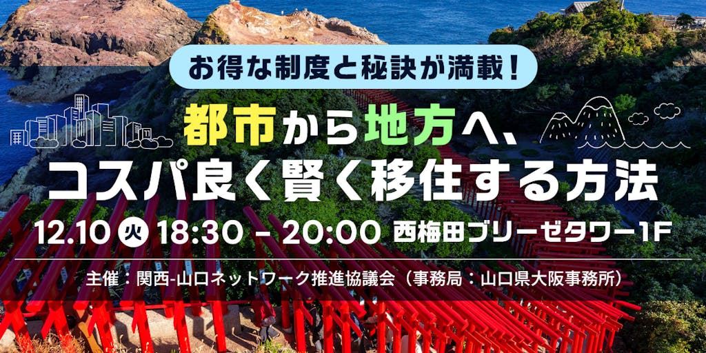 今回のテーマは「地方移住で実現する高コスパ生活」 このセミナーでは、山口県が独自に設ける移住補助金を活用して、関西から山口県へ実際に移住したゲストを招いて、移住に至るまでのステップや移住後の生活費の変化についてなど、具体的な体験談をお話いただきます。 移住検討時に気をつけたいポイントや、利用するとお得な制度についても詳しくご紹介し、移住に関する役立つ情報をお届けいたします!