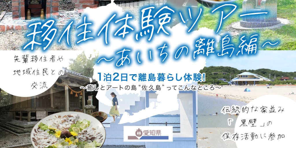 ●開催日時 2025年1月25日(土)AM10:20 JR名古屋駅集合 2025年1月26日(日)PM17:00 JR名古屋駅解散 ●行き先 佐久島(愛知県西尾市) ● 参加対象者 離島の暮らしに興味のある18歳以上の方(子供連れの方もご相談ください) 行程表に記載のすべてのプログラムにご参加いただける方 ツアーや移住に関するアンケートにお答えいただける方 ● 参加費 9,000円(一泊夕・朝食、保険代、交通費込み)(お一人様) ※1日目の昼食は実費にてご負担いただきます。 ※集合場所(名古屋駅まで)の往復交通費は含まれません。 ● 申込方法 メール件名を「移住体験ツアー申込」とし、本文に「①氏名(漢字・ふりがな)、②年齢、③住所(郵便番号・住所)、④携帯番号、⑤E-mailアドレス、⑥アレルギーのある食品等、⑦同行者(漢字・ふりがな・年齢)、⑧お部屋に関するご希望等」を記載し、送信してください。 ★申込先アドレス mailto:ijyu@alphapoint.co.jp ● 申込締切 2025年1月13日(月・祝)まで ● 定員 10名 ※最少催行人数(6名) ●行程等詳細 下記URLからご確認ください。 https://www.pref.aichi.jp/press-release/aichi-yamazatoritou.html ※応募したい方はまずこのページの「興味ある」または「応募したい」ボタンを押してください!
