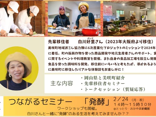 ・先輩移住者セミナー 白川さんより、移住のきっかけや移住前後の生活環境の変化、”発酵”がある生活など、 リアルな体験談をお話しいただきます。