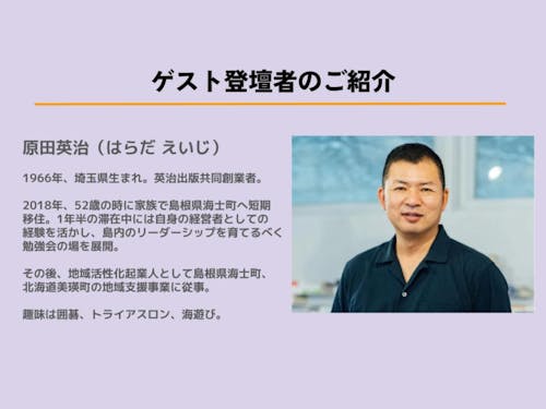 イベント第一部のゲストは、英治出版共同創業者の原田英治さん。 埼玉県出身の原田さんは島根県海士町への短期移住を経て、地域活性化起業人として同海士町、北海道美瑛町の地域支援事業に従事しました。 地域での活動経験が豊富な原田さんのトークは、参考にしたいTips(コツ・テクニック)が満載。アーカイブ動画には、原田さんによる「50代からの地域貢献 3か条」の紹介もあるので要チェック!