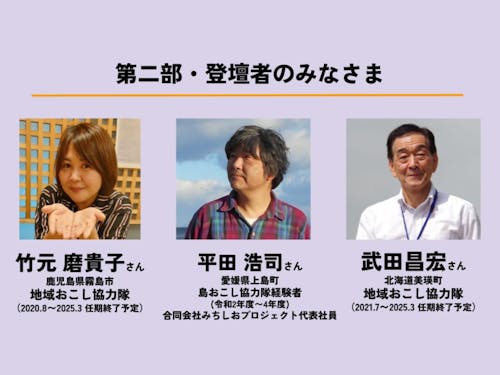 第二部では、先輩協力隊員3名が登壇。それぞれの活動体験や、地方移住後に直面した課題について赤裸々に語りました。 鹿児島県霧島市の地域おこし協力隊・竹元磨貴子さんが移住を考えたきっかけは「息子さんの進学」。愛媛県上島町の島おこし協力隊経験者・平田浩司さんは「ゲストハウス開業のため」。北海道美瑛町の地域おこし協力隊・武田昌宏さんは「親の介護のためのUターン」。 目的や想いはそれぞれ違っても、50代以上で地域おこし協力隊にチャレンジした3名のゲストに聞くTipsも必見です!