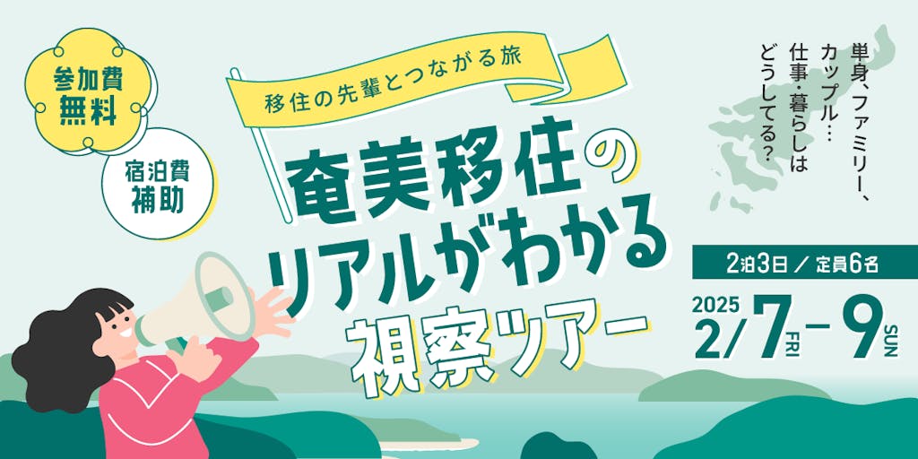 ① 単身移住、カップル移住、ファミリー移住、二地域居住…いろいろなタイプの先輩移住者をご紹介・交流していただけます ② 先輩移住者の働き方も色々!転職なき移住、現地就職、現地起業といったさまざまなパターンのメリット・デメリットを直接質問できます! ③ 現在求人募集中の企業へ見学予定!「奄美で働く」具体的なイメージを持っていただけます ④ 奄美の不動産巡りも実施予定!さまざまなタイプの不動産をご案内します ⑤ 奄美市の移住担当者からの説明会も行います ⑥ プログラムの参加は無料、宿泊費の補助もあります(現地までの交通費は自己負担いただきます)