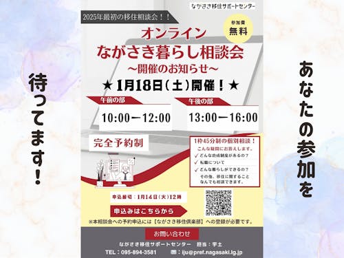 2025/01/12「長崎県に住んでみたいけど、なにから始めたらいいの?」「移住にはどんなサポートがあるの?」と迷っていませんか? そんなあなたに、今すぐチェックしてほしいイベントがあります。 2025年1月18日(土)、長崎県が主催する【オンラインながさき暮らし相談会】が開催されます。