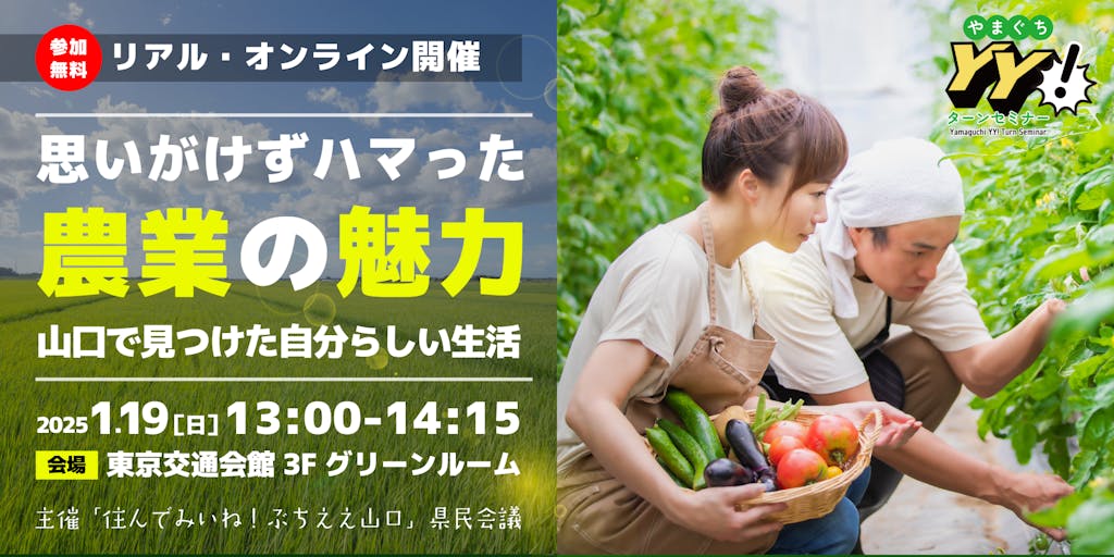 実際に移住して農林業を始めた3人のゲストがそれぞれのリアルな体験談を語ります。なぜ農林業を選んだのか?具体的なストーリーを通じて「農林業の魅力」や「山口での暮らし」をお伝えします。 また、山口県の農林業を全力でサポートする制度や、農林業初心者でも安心して始められる環境についても詳しくご紹介します。 農林業の魅力を知りたい方や、地方での新しいライフスタイルに興味がある方、これから移住を検討している方など、幅広い方に役立つセミナーです!