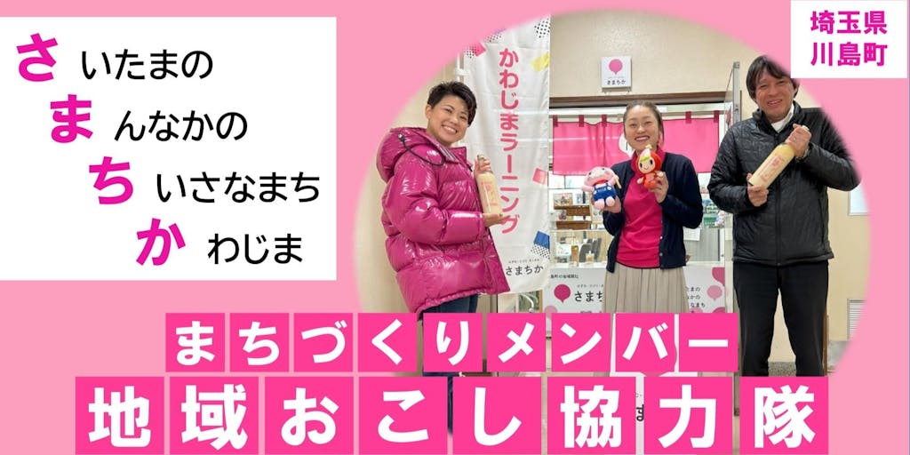 2025/03/10川島町は埼玉県のほぼ中央に位置する、自然豊かなまちです。 豊かな自然の中に溢れる観光スポットや特産品に恵まれてはいるものの、町の魅力発信はまだまだです。 町の魅力をより多くの方に「伝えたい!」「知ってほしい!」 多くの方とのつながりの中で、様々な人が交流する機会を増やし、町の「ファンになってほしい!」。 そんな思いで、地域商社「一般社団法人さまちか」は活動を実施しています。 さまちかでは、町の魅力を発信していくメンバーを地域おこし協力隊として募集しています。