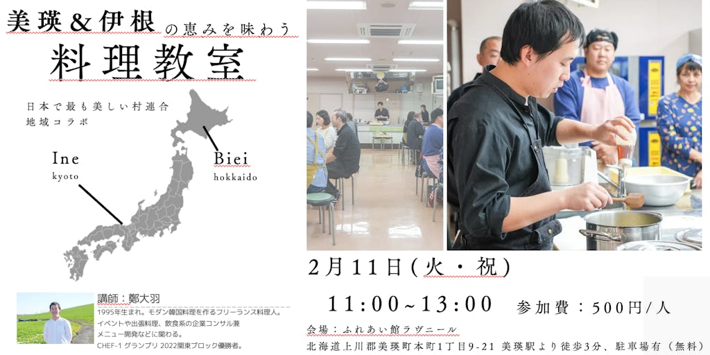 毎月のように、イベントを開催しています。2月は日本で最も美しい村連合の伊根町から、食材を仕入れて海の幸、美瑛の丘の幸と共に、料理人のテウさんの料理教室を開催します。私たちの活動にご興味のある方は、ぜひご参加くださいね。お待ちしています!