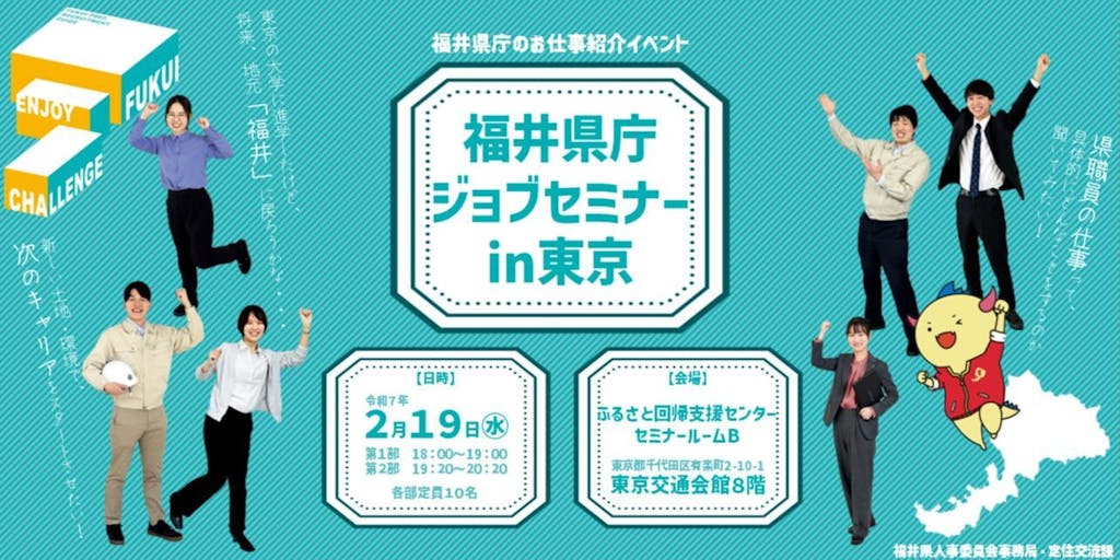 イベント名:福井県庁ジョブセミナーin東京 日時:令和7年2月19日(水) 第1部 18:00~19:00 第2部 19:20~20:20 ※各部とも同じ内容です。ご都合の良い時間帯でお申込みください。 会場:ふるさと回帰支援センター セミナールームB (東京都千代田区有楽町2丁目10-1 東京交通会館8階) 対象:福井県庁の業務に関心のある大学生、社会人の方 定員:各部10名(先着順、事前申込制) お申込み:令和7年1月22日(水)~2月12日(水) 下記のリンクからお申込みください。 https://forms.office.com/r/AciKxUHavy お問合せ:福井県人事委員会事務局/福井県定住交流課