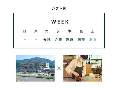 【医療介護領域の主な業務内容】 ・医療や介護施設での事務業務や、ヒューマンケア業務 ・飲食業や観光業などの事業者での配膳・接客業務 医療介護領域のコメディカル職を中心としながら、地域内の様々な業種に従事していただきます。 どの業種を掛け合わせるかなどは事務局との面談で決定。 現在のマルチワーカーの主な就業先については、こちらの記事をご覧ください。 https://smout.jp/plans/19072