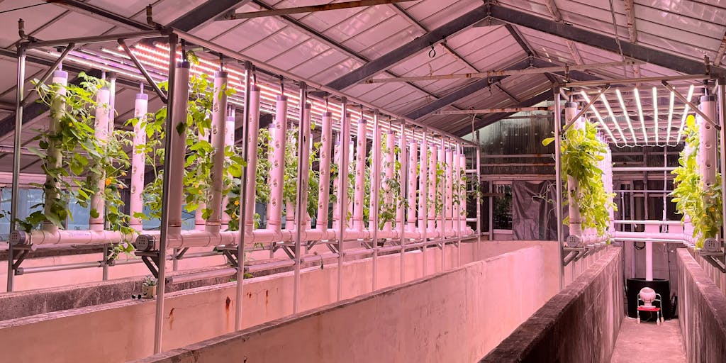 一般的な水耕栽培は、平らな水槽にレタスなどの葉物野菜が育つイメージですよね。私たちが取り組んでいるのは、それを縦のパイプにして、肥料を溶かした水を循環させるという仕組みなんです。これが「縦型水耕栽培」と呼ばれるもので、縦にすることで、横型に比べておよそ3.3倍の作物を育てることが可能となります。 さらに、葉物だけでなくイチゴや小玉スイカといった、収益性の高い作物も栽培できます。