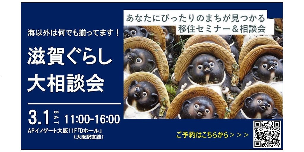 日時:2025年3月1日(土) 相談会 11:00~16:00 セミナー11:00~12:15 会場:APイノゲート大阪11F「Dホール」(大阪駅直結) 内容:各市町へ個別に相談できる相談会、生活者目線・移住者目線で比較検討できる 移住セミナーを開催 11市町と滋賀県の相談ブースをご利用いただけます。 得点:ご参加いただいた方に、環境に配慮した滋賀県のノートをプレゼント!