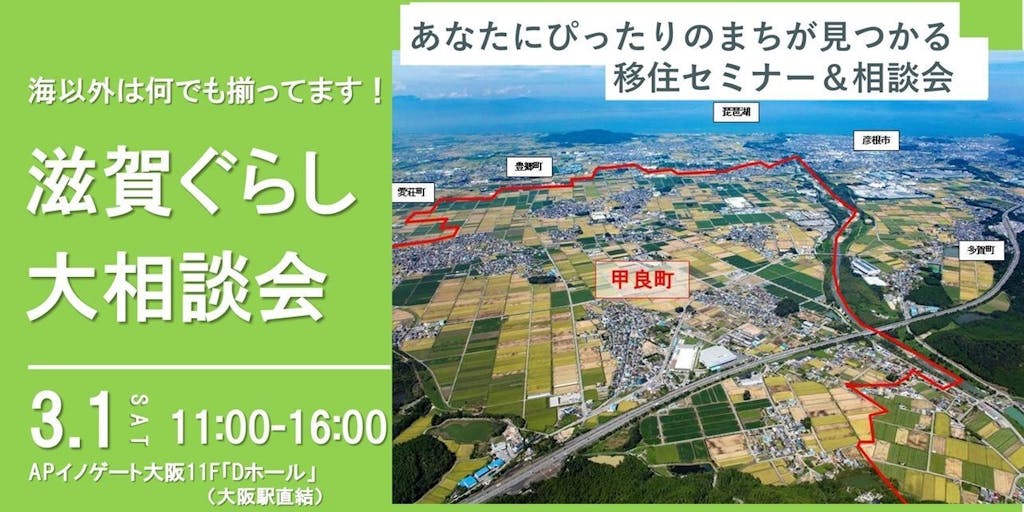 開催概要 日時:2025年03月01日(土)11:00〜16:00 セミナー:11:00〜12:15 会場:APイノゲート大阪 11階「Dホール」 内容:相談会・セミナー 主催:滋賀移住・交流促進協議会 参加市町 :大津市・彦根市・長浜市・近江八幡市・甲賀市・高島市・東近江市・米原市 日野町・愛荘町・甲良町