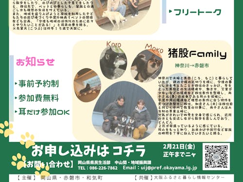 2025/02/14大事な家族の一員との将来の暮らし 先輩移住者の話をヒントに考えてみませんか 〇現在ペットと暮らしている方で、今後の生活スタイルを検討中の方、