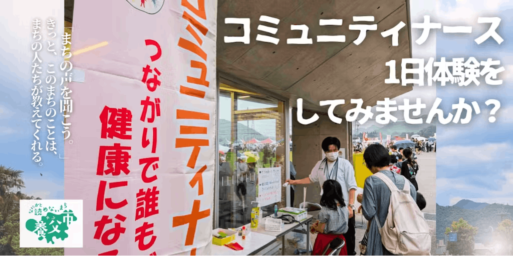 土居さんが地域に入ると必ず聞かれる質問なんだとか。医療行為をする訳ではない“コミュニティナース”は、もしかしたらまだまだ世の中に浸透していない言葉で、それを語れる人も少ないのかもしれません。 Q.コミュニティナースの定義とは? 活動する場所は「住民のそば」。住民と一緒に”毎日の楽しい”と“心と体の安心”をつくる医療人材として活躍する看護職者を指します。病気の有無は関係なく、地域で生活する全市民が対象。病院、クリニックの看護師、訪問看護師、保健師がカバーしきれていない領域でも活動をすることができます。コミュニティナースとのつながりを通じて、健康意識を高めて健康寿命の延伸や、医療や福祉、行政機関への橋渡しを行うことができます。コミュニティナースは、高齢化の進行に伴う「社会的孤立」に対し、薬と同じように「社会とのつながり」を処方する「社会的処方」の推進を図る役割を担っている存在なんです。 養父市では2024年4月に養父市役所の部署のひとつとして「社会的処方推進課」が誕生しました。地域おこし協力隊の配属も行われていて、全国の中でも「社会的処方のまちづくり」が進んでいる地域だと感じます。行政・関連機関・コミュニティナースの仲間たちと連携して「孤立しない社会」の創造を目指して活動を行っています。 Q. 普段はどんな活動をされていますか。 活動をはじめて3カ月が経ちました(7月の取材時時点)。今の活動は、市内にある地域自治協議会を回って、各地の取組みについて学んでいるところです(大きく分けると養父・八鹿・大屋・関宮の旧4町があり、このうち関宮地域を担当することになりました)。主にご高齢の地域の方々が集まる「ふれあい喫茶」や「認知症カフェ」「朝市」などが実施されています。取組みにはその場所の特色や歴史を感じることも多く、イベントに参加をすると住民の皆さんと沢山お話しさせてもらえるので自身の楽しみにも繋がっています。 実際に地域を回ってみて、養父市には地域とのつながりを感じられるコミュニティがたくさんあるんだな、という印象を持ちました。地域の皆さんが自分に出来ることを自発的に楽しまれていると思います。ただ「参加者や運営するスタッフが年々少なくなってきた」などと課題がないわけではないので、コミュニティナースとして地域の皆さんに寄り添い、一緒に解決法を見つけていければと思っています。 地域おこし協力隊の副業として地域交通ライドシェアの「やぶくる」ドライバーや、スマートフォン出張相談の講師。市民ドック会場で保健指導や問診役なども行っています。先日は地元のお祭り「YBファブのナツフェス!」にて救護要員として参加をしていました。 まずは色々なところへ顔を出して「コミュニティナース」という存在や「自分の顔」を覚えてもらいながら、自分自身も地域を回ることで養父市のことをもっと知っていきたいです。 地域の方とお話しをすることはつまり、「そのまちの声」に耳を傾けること。 地域を知る上で、これ以上の情報源はないのではないかな?と思います。 コミュニティナースの活動のやりがいや楽しさを土居さんのお話しから感じることができました! ここまでお読みいただいて “コミュニティナースとっても楽しそう!”と思われた方。 もっと詳しく活動を知ってみたいという方は、 【1日コミュニティナース体験】をしてみませんか?