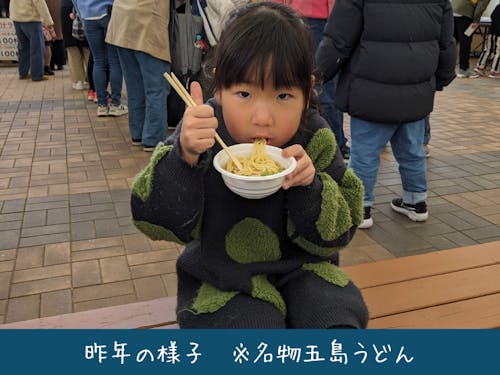 ###飲食ブース 油かす×五島うどん試食会≪先着200食限定・11時30分提供開始予定≫ 新上五島町名物五島うどんに大阪名物油かすをトッピングして無料配布します。 大阪出身の地域おこし協力隊が、腕をふるいます。 地元の味を食べ、身も心も暖まること間違いなしです。 あおさの試食会≪先着約50食・11時提供開始予定 地域おこし協力隊が丁寧に育てた、新鮮なあおさを無料配布。 あおさのお味噌汁や佃煮を試食できます♪ ###活動報告ブース