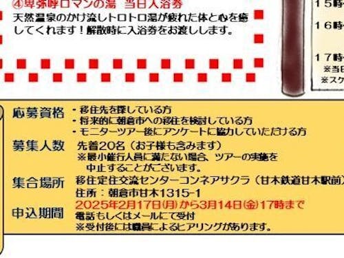 ・朝倉市移住体験&空き家見学モニターバスツアー(先着20名、参加費は無料) 応募の前にチラシをご覧ください (申込期間)2025年2月17日〜3月14日17時迄