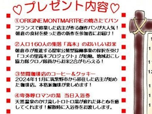 バスツアーの参加者には朝倉の魅力がつまったプレゼントがあります。 ・「ORIGINE MONTMARTRE(オリジーヌモンマルトル)」春の新作パン ・「米の里 高木」美味しいお米2合 ・「焚間珈琲」珈琲&クッキー(交流会時) ・「卑弥呼ロマンの湯」当日入浴チケット