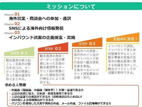 五島市への観光をさらに盛り上げていくためには「外国人観光客(インバウンド)」の誘客が重要です。現在は日本人の市職員が海外での営業活動や海外向けの情報発信に取り組んでいますが、さらに誘客を促進していくために、第一言語が「韓国語」の地域おこし協力隊を募集します。