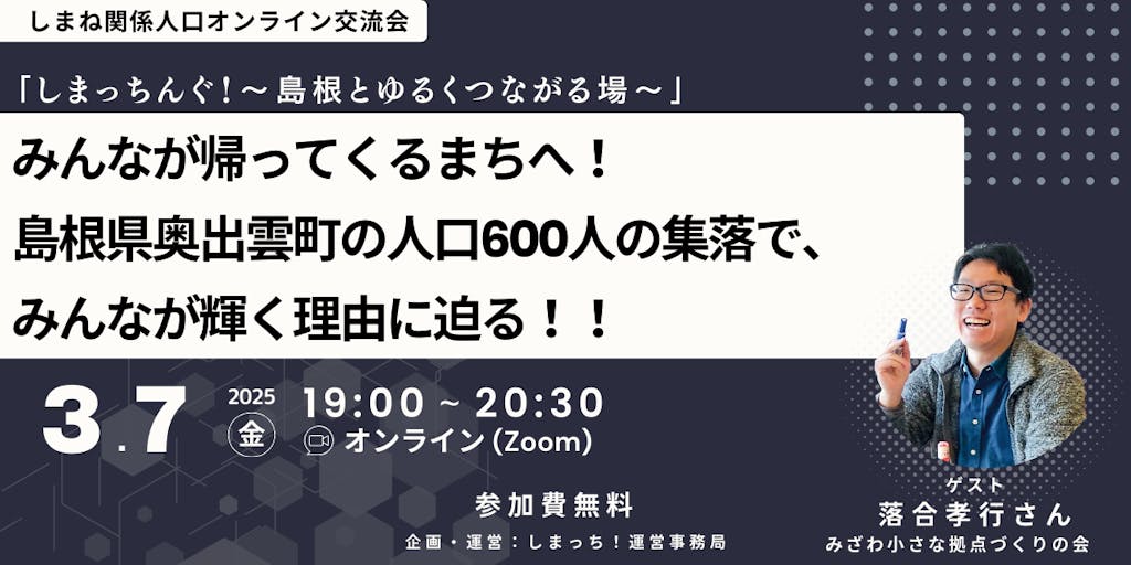 〇日時 2025年3月7日(金)19:00~20:30 〇会場 オンライン(zoom) ※お申込み後、参加URLをお送りいたします。 〇参加費 無料 ※通信料は自己負担となります ※申込は2025年3月6日(木)17:00まで 〇対象 島根の地域づくり、まちづくりに興味がある 奥出雲町の取り組みや地域に関心をお持ちの方 地域と関わってみたい、関係人口に興味がある方ならどなたでも!