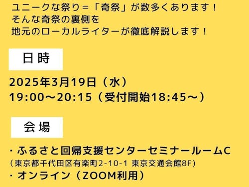 2025/03/19福井県には、全国的に知られていないユニークな祭り=「奇祭」が数多くあります! そんな奇祭を地元のローカルライターが徹底解説! お祭りや旅行が好きな方など、少しでも地方に関心がある方はどなたでもご参加いただけます‼️