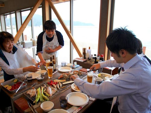 センザキッチンの店内にはバーベキューコーナー「グリルハウス」が併設されており、店内で買った食材をグリルハウスで自分で焼いて食べることもできます。店内で購入した新鮮な魚介類、肉類、野菜など、その場で調理して食べることができるのも魅力のひとつ。家族や友人たちと来店し、仙崎の青い海が目の前に広がる最高のロケーションの中で食事を楽しむ観光客も多くいらっしゃいます。