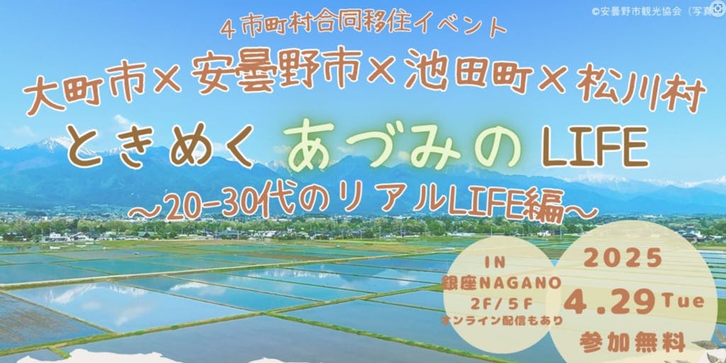北アルプスの麓で田園風景が美しく、移住検討者から人気のエリアである「安曇野」の4市町村が合同で、20-30代の移住を検討している方に向けたイベントを開催します。漠然と安曇野のような美しい景色が広がる地域で生活をしてみたい…とお考えの方、お待ちしております。 今回は、ゲストクロストークにて、”あづみの”における20-30代のリアルLIFE事情を聞くことができます♪(オンライン視聴もOKです)