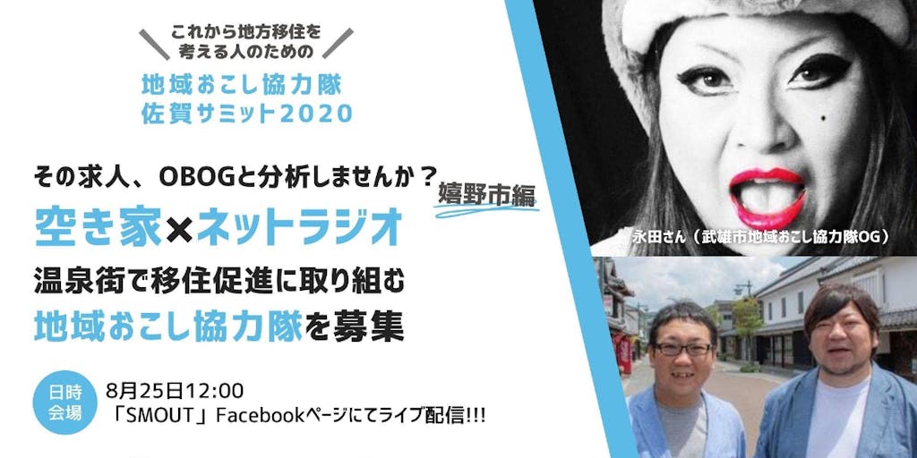 ・スケジュール: 【スケジュール】 第1週目 8月18日(火)12時~ *配信済* キックオフミーティング! 「佐賀県移住?地域おこし協力隊?ホントのコトをOBOGに聞いてみよう」 見逃し配信はコチラ↓ https://www.facebook.com/smoutjp/videos/1229670990735704/ 第2週目 8月25日(火)12時~ *今週* その求人OBOGと分析しませんか? 嬉野市編 「空き家×ネットラジオ」 温泉街で移住促進に取り組む協力隊募集 当日時間になりましたらURLよりアクセスしてください。 ▶︎https://www.facebook.com/smoutjp/live/ 第3週目 9月1日(火)12時~ その求人OBOGと分析しませんか? 〇〇〇編 Coming soon... 第4週目 9月8日(火)12時~ 現役&OBOGとお話してみませんか? オンライン大交流会