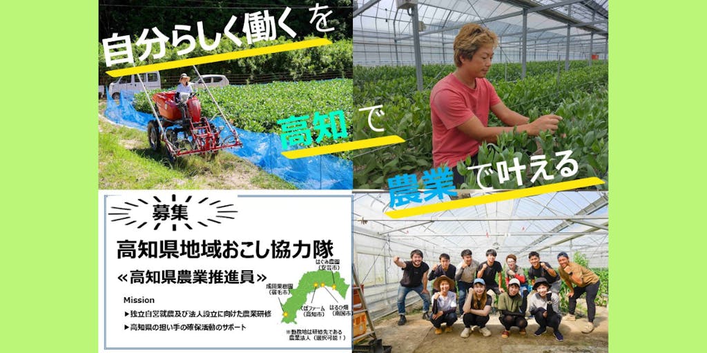 ビジネス感覚に優れた農業法人のもとで栽培技術や経営ノウハウを習得し、 将来的には自らが農業経営者となることを目指していただくことと、高知県の担い手確保の取り組みをサポートしていただくことで、本県の農業振興を支援する。