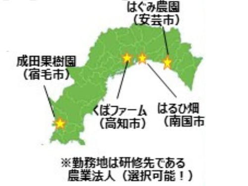 ポイント1:勤務先や栽培品目は、研修先である受入法人から選択できる! 現在、4つの農業法人が受入法人として登録しており、今後も受入法人を増やしていく予定です。