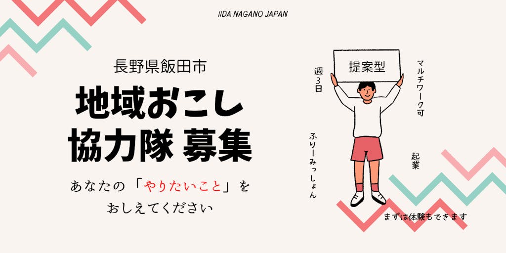 ○業務内容:地域の皆さんと協働しながら、隊員の経験や能力を活かした活動を行っていただきます。 ○雇用形態:雇用関係は無し。飯田市から委嘱します。 ○委嘱期間:委嘱の日から令和8年3月31日まで(最長3年まで延長の可能性あり) ○活動時間:週21時間(1日7時間×3日)、月86時間が標準。年1033時間以上。 ○応募受付期間 2025年5月9日まで