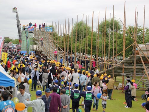 『あじさい祭り』では、多古町の自然をアピールする魅力的な催物を数多く行ってきました。 殿・姫に扮した人々が多古米やお菓子をふるまう『五穀豊穣式典』や、竹を使用したスリル満点のアトラクション『竹コースター』など、思わず目を引かれる催物が目白押し! 町を彩るあじさいを眺めながら、祭りをお楽しみください。