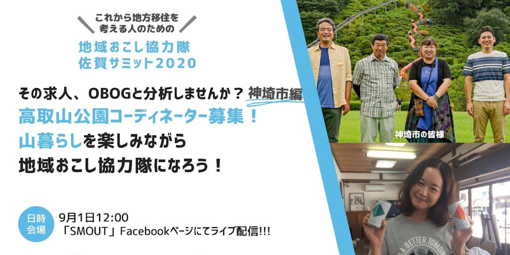 第3週目 9月1日(火)12時~ *今回* その求人OBOGと分析しませんか? 神埼市編 【高取山公園コーディネーター】山暮らしを楽しみながら協力隊になろう! 当日時間になりましたらURLよりアクセスしてください。 ▶︎https://www.facebook.com/smoutjp/live/ 第4週目 9月8日(火)12時~ 現役&OBOGとお話してみませんか? オンライン大交流会