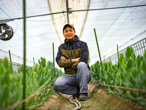 Q:トルコギキョウ栽培のやりがいは? 自分の頑張りがそのまま収入に反映されるところです。 作業の積み重ねや工夫のひとつひとつが数字として返ってくるので、日々の仕事にも自然と力が入ります。思うような結果が出ないときも、原因を振り返ってすぐに改善できるのがこの仕事の良いところです。(廣野さん)