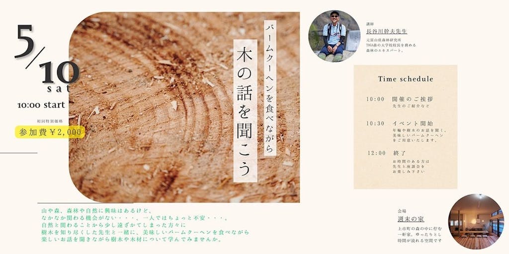 2025/04/29山や森、森林や自然に興味はあるけど、なかなか関わる機会がない・・・、一人ではちょっと不安・・・。 自然と関わることから少し遠ざかってしまった方々に樹木を知り尽くした先生と一緒に、美味しいパームクーヘンを食べなから楽しいお話を聞きながら木や木材について学んでみませんか。