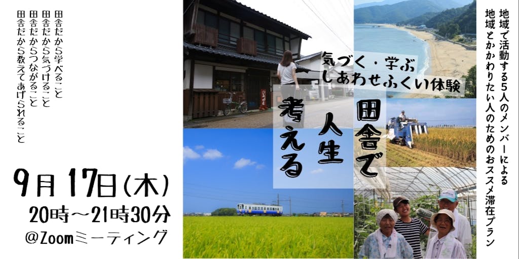 ・スケジュール: 19:45~ 入室開始 20:00~ 開始 福井県からのお話 20:05~ しあわせふくい体験紹介 案内人5名からご紹介 20:55~ グループ相談 グループに分かれて詳しく相談対応 21:30 終了