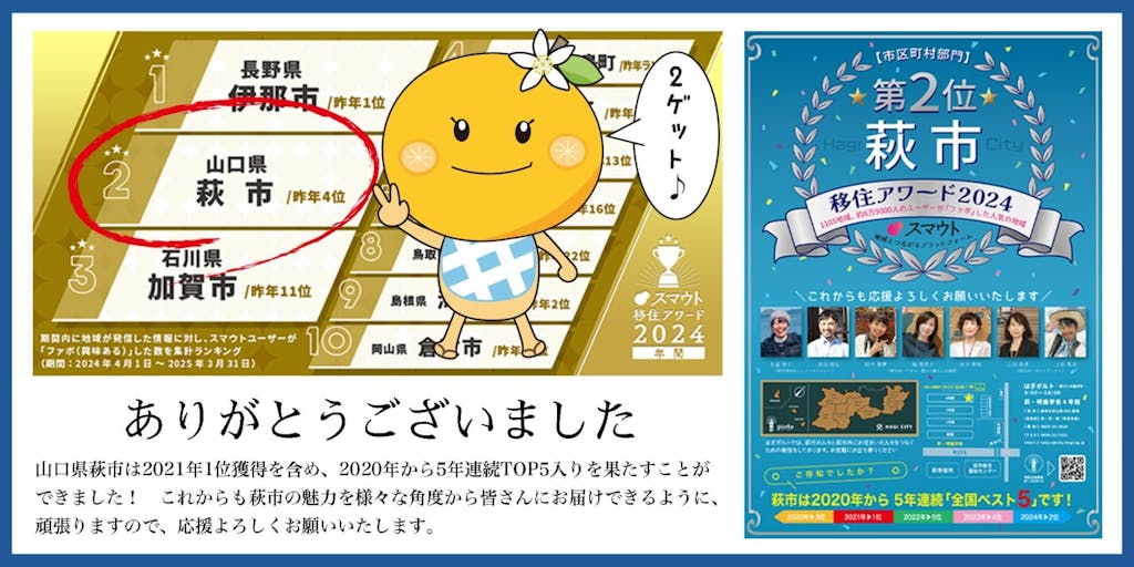 スマウト移住アワード2024 萩市は堂々の2位!!(市区町村部門)