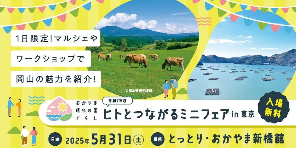 2025/05/30岡山県では、地域との関わりに関心のある方や、移住を視野に入れている方などに向けて、 "地域の魅力"と"人とのつながり"をテーマにした体験型イベント 「ヒトとつながるミニフェア in 東京」を初開催します。