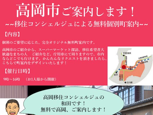 高岡市では、移住をお考えの方の現地サポートとして、リクエスト頂いたお日にちに合わせて、無料町案内を開催しております。