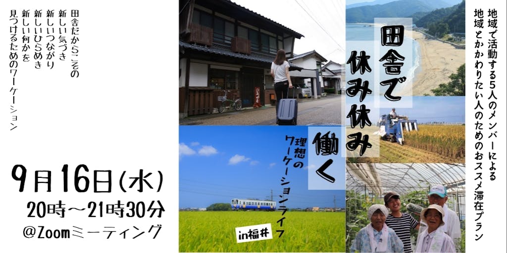 「田舎で休み休み働く~理想のワーケーションライフin福井~」では、田舎でひと息ついて、リフレッシュできるおすすめのワーケーション場所をご紹介します。 福井をPRする移住チームメンバー5人が、おすすめのプランをご案内。 山、海、川などの自然と触れ合う+αの体験はもちろん、伝統工芸、農林漁業、地域活動など、ちょっと違った体験のご紹介も。