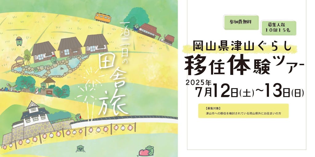 2025/06/132025年7月12日(土)から1泊2日で、津山市を巡る『岡山県津山ぐらし移住体験ツアー』を開催します!! 「たくさんの候補地から自分にあった地域を探したい」と既に情報収集を始められている方も、「引っ越しをして新しい土地で暮らしたい」と検討し始めたばかりの方も、ぜひご参加ください!!