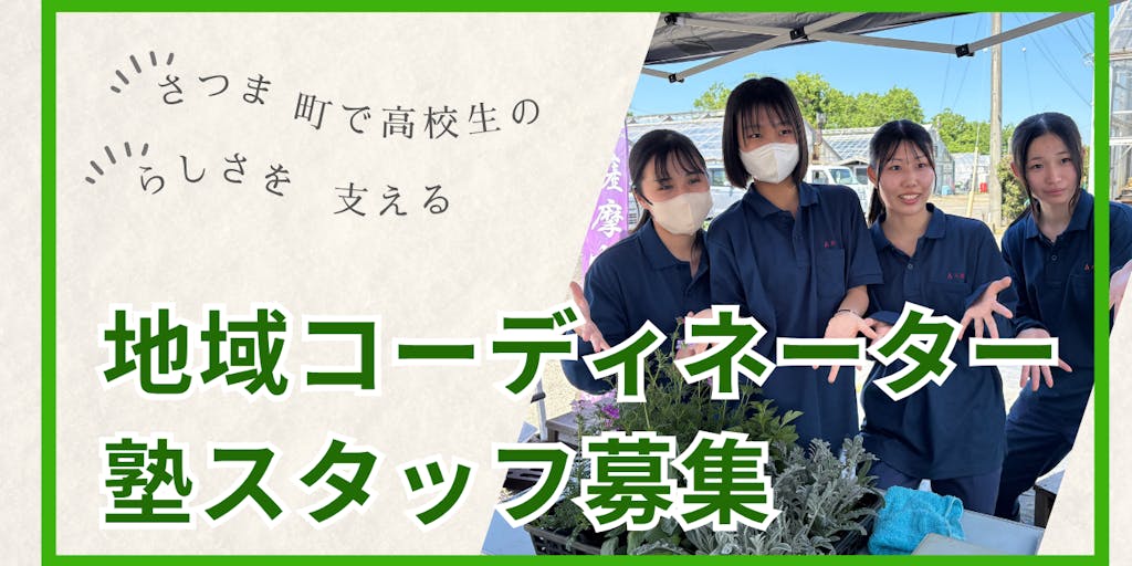 ①【公営塾スタッフ】 ・さつま町が運営する高校生対象の公営塾での指導、および高校や町と連携した公営塾の運営 ・生徒個々の放課後の体験活動支援、幅広い学びの支援 ・生徒の学習・探究活動の成果を総合型・学校推薦型選抜入試などの進路実現につなげるサポート ・上記のほか、薩摩中央高校の魅力化に資する業務