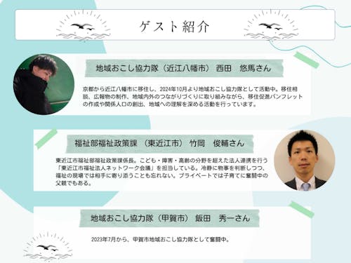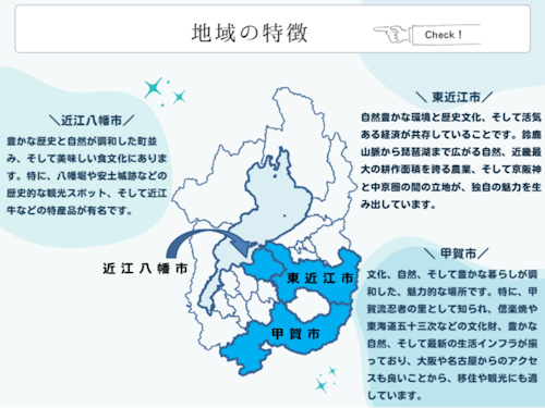 ・都会過ぎないけれど、ちょっと便利な暮らしがしたい方 ・移住後、資格を活かして働きたい方 ・地域おこし協力隊に興味がある方 ・できれば自転車や徒歩で生活できるところで暮らしたい方 ・ドライブが好きな方 ・関西圏や中京圏に実家があり、ちょうどよい距離感で暮らしたい方 ・びわ湖の近くに住みたい方 ・山に囲まれた生活がしたい方 ・田園風景のある地域に住みたい方 ・農ある暮らしを営みたい方 ・地元企業で働きたい方 ・京都や大阪、名古屋、岐阜で普段は働き、休日はゆっくり過ごしたい方 ・なんとなく滋賀県に住んでみたい方 ・歴史ある街並みに興味がある方 ・自然に囲まれてのびのびと子育てをしたい方 ・1日で効率的に複数の地域情報を得たい方