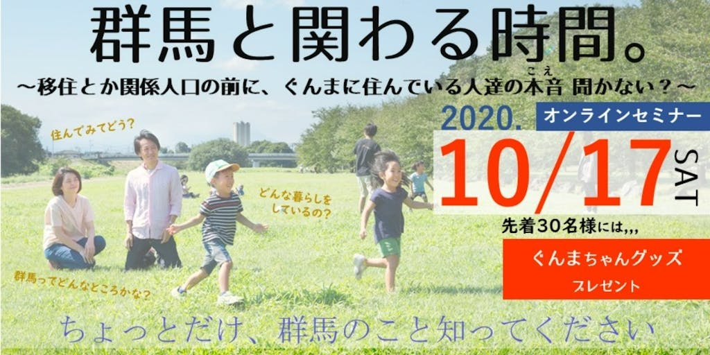 2020/10/16「移住」とか「関係人口」の前に、先ずは「ぐんまに住んでいる人達の本音」を聞いてみませんか? 群馬で子育て中の3名のゲストを招いて、「群馬の日常」をお届けするオンラインイベントです。 お気軽にご参加できるイベントですので、ぜひ、皆様のお申込みをお待ちしております!