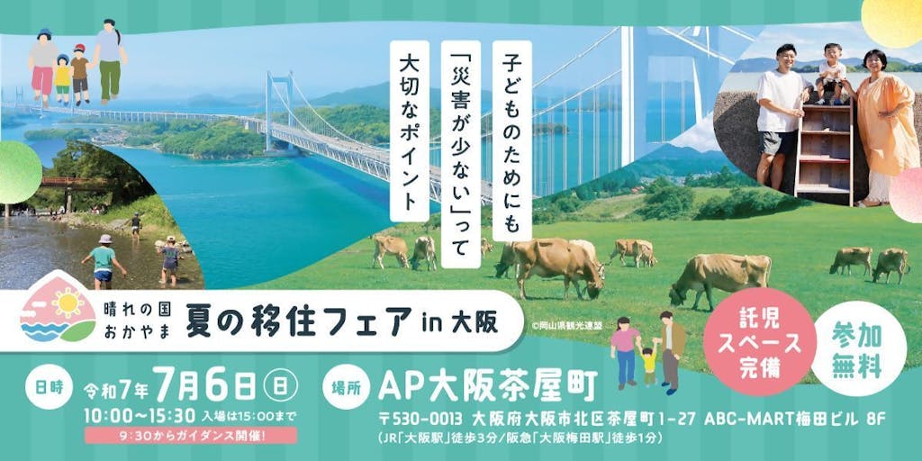 2025/07/01移住相談会「晴れの国おかやま 夏の移住フェアin大阪」が7月6日(日)に開催されます。 この相談会には、岡山県内22市町、就職相談ブースなど多数出展します。もちろん、われらが新見市も出展します。 新見市では、“田舎で子育て”“二拠点居住”“地域おこし協力隊”に興味ある方大歓迎!もちろん、ざっくりと地方移住を考えてるという方もOK!ぜひ、みなさんお越しください!