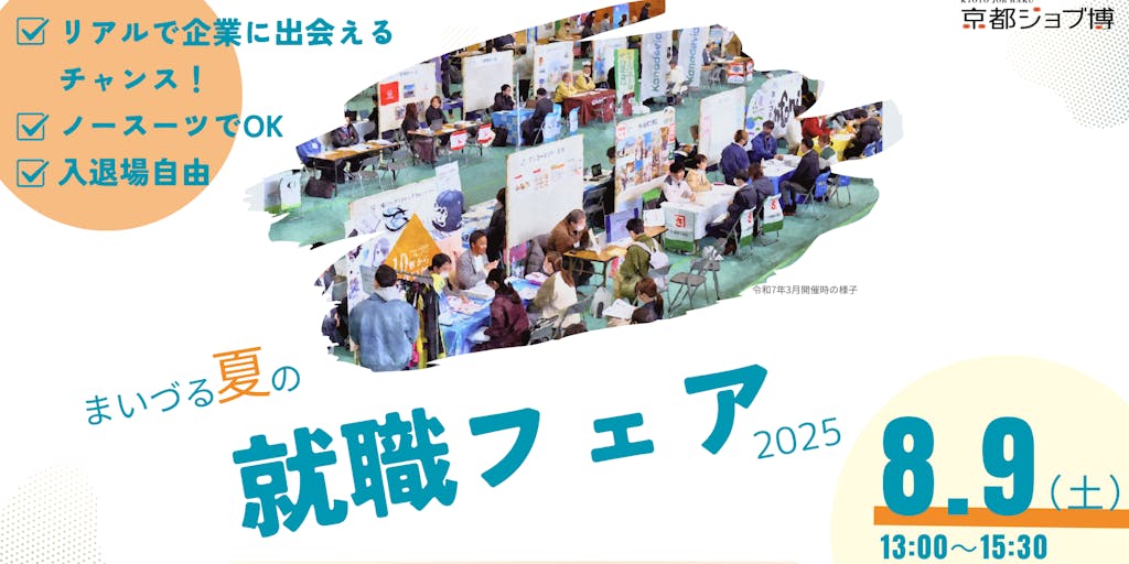 日時 2025年8月9日 (土) 13:00~15:30 会場 舞鶴市商工観光センター 4階・5階 (舞鶴市字浜66) 対象者 ・舞鶴市内での就職・転職を希望される方 ・業界研究をしたい学生の方(学年不問) ・お子様の就職活動について情報収集したい保護者の方>など、舞鶴での就職に関心のあ る方ならどなたでも大歓迎です。 参加費 無料 服装 ノースーツでOK どんな企業が参加するの?もっと詳しく知りたい!という方は、まずこのページの「興味ある」または「応募したい」ボタンを押してから、下のリンクからウェブサイトをチェックしてみてくださいね。 https://jobnavimaizuru.com/2025/06/23/r7summer/