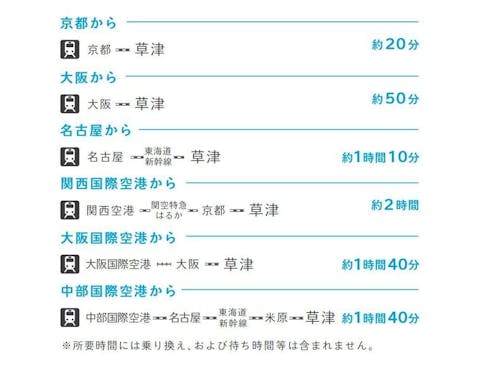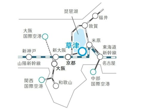 JR草津駅から京都駅は新快速で21分、大阪駅へは51分。 しかも、その新快速は約15分に1本走っています。 アクセスが良いため、京都、大阪は、通勤圏内です。 ちなみに、名古屋へは、新名神高速道路の「草津田上IC」から車で約90分です。 こちらも遊びに行ける距離ですね。