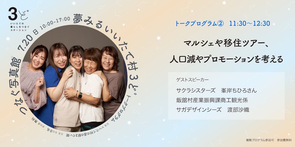 2025/07/04いいたて移住サポートセンター「3ど°」が行うイベント開催のお知らせです。 昨年大好評だった「つなぐ写真館」に加え、今年は「夢みるいいたて村3ど°トークプログラム」も同時開催いたします! 各回登場する想いのあるスピーカーのトークを通じて、村での生業、これからの可能性を感じながら、あなたの夢や希望を聞いてみませんか。